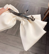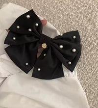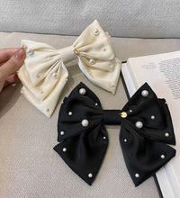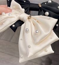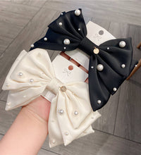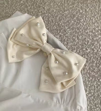 A sophisticated bow hair clip adorned with delicate pearl accents for a refined and timeless look. Crafted with a smooth fabric finish and a secure clasp, this accessory adds effortless elegance to any hairstyle.