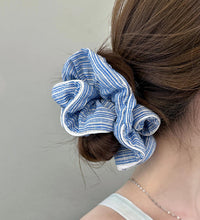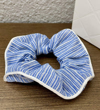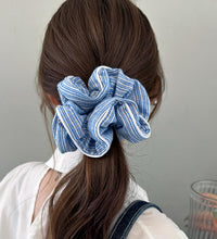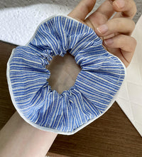 A soft cotton scrunchie featuring a classic striped design with a vintage-inspired look. Gentle on hair and comfortable to wear, it provides a secure hold while adding a casual, effortless style to everyday hairstyles.
